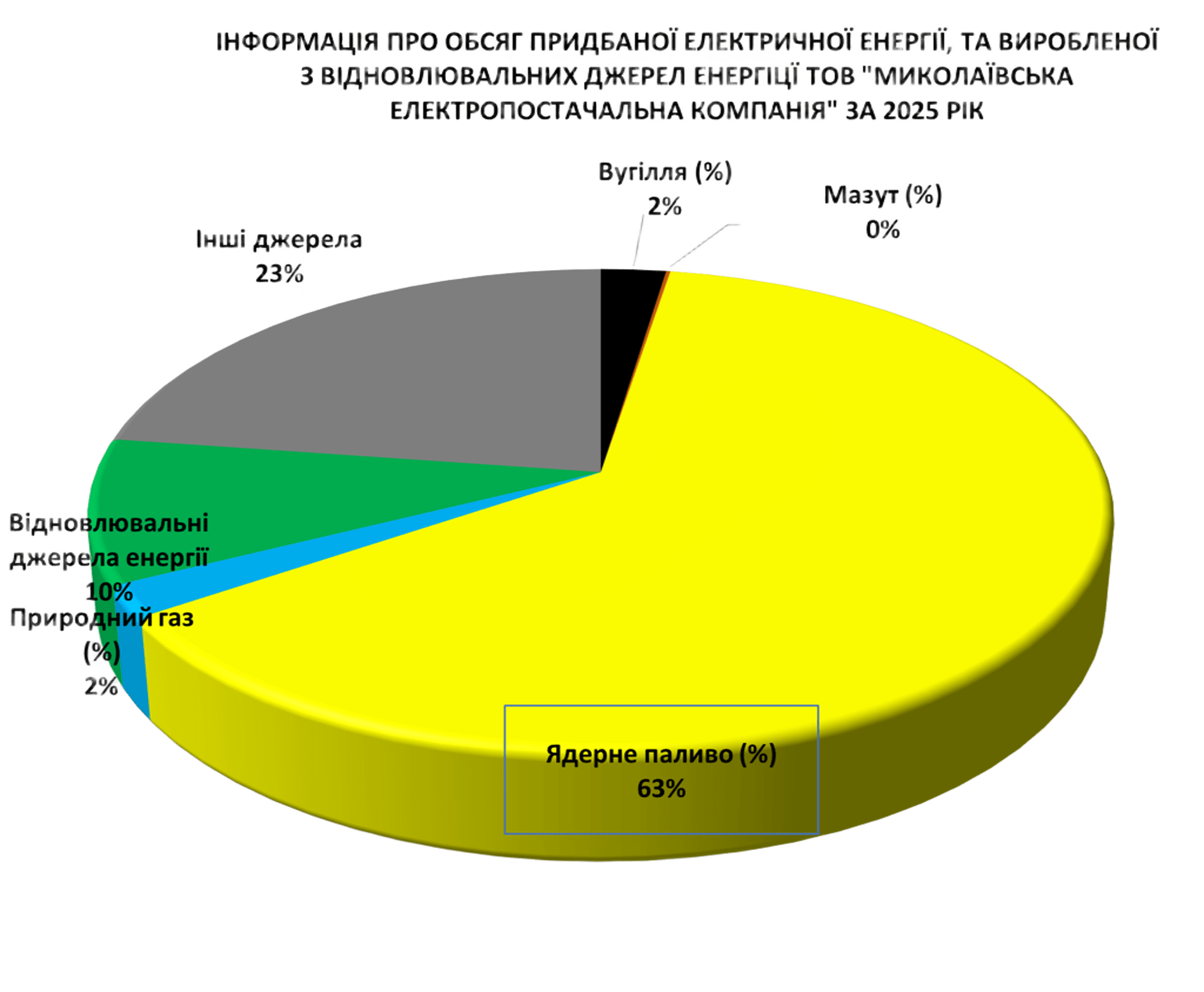 Відповідно до постанови НКРЕКП від 27.12.2023 №2626 «Про затвердження Порядку розкриття інформації споживачам електричної енергії про джерела енергії, у загальній структурі балансу електричної енергії, придбаної електропостачальником та/або виробленої на його власних електроустановках» ТОВ «Миколаївська електропостачальна компанія» надає інформацію про обсяг придбаної електричної енергії, та виробленої з відновлювальних джерел енергії за 2025 рік.